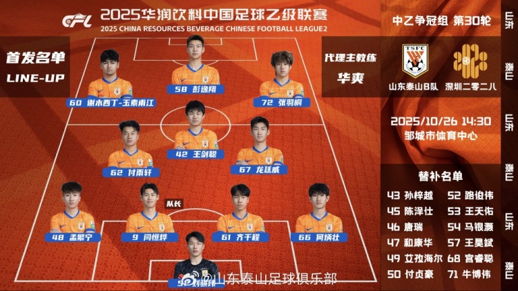 中乙第30轮争冠组山东泰山B队vs深圳二零二八首发声势 💪💪