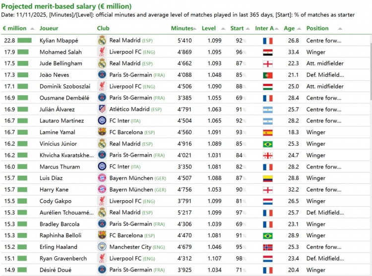 CIES球员应得最高年薪排名:姆巴佩2280万欧居首,萨拉赫位居次席