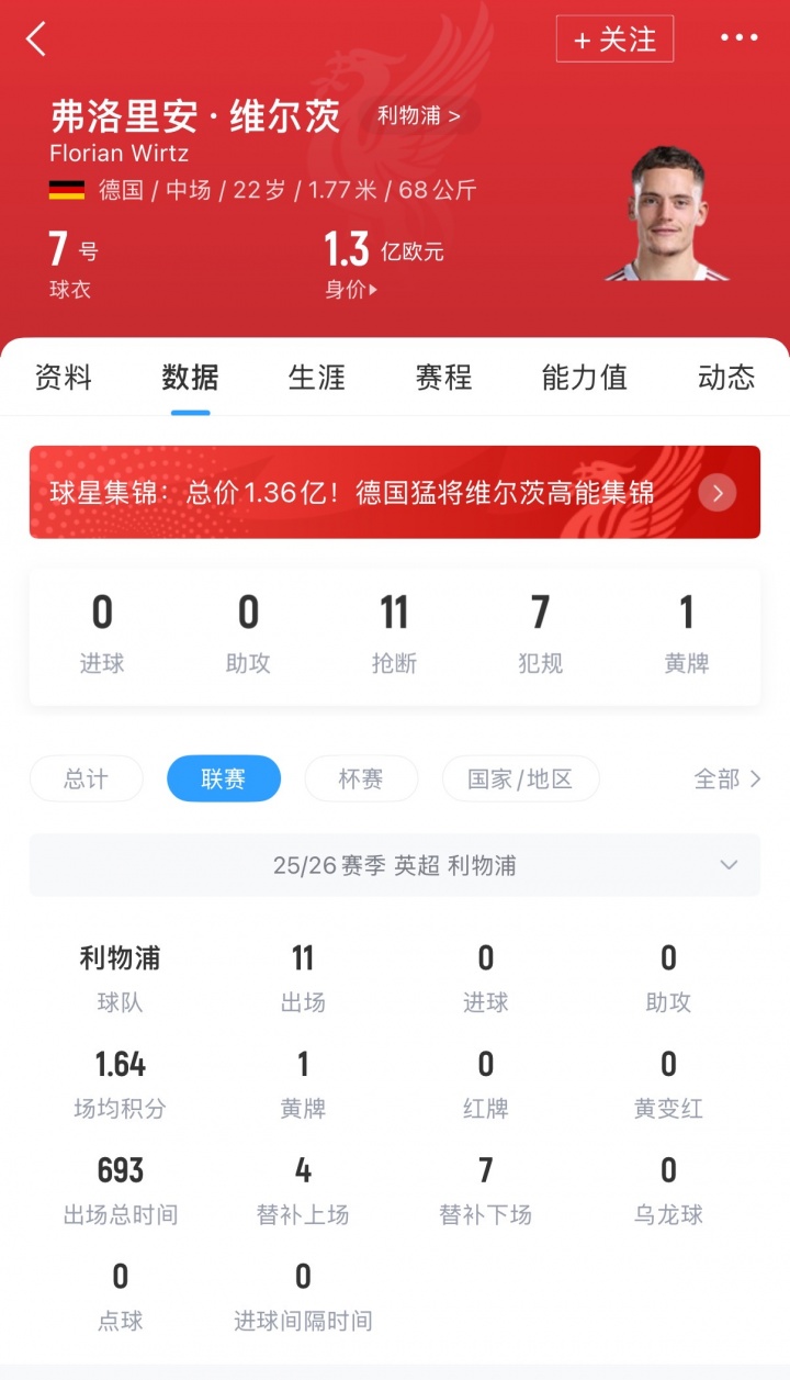 维尔茨在今夏以1.25亿欧元转会费加盟利物浦,现在这位德国中场在英超出场11轮后仍莫得赢得进球以及助攻。