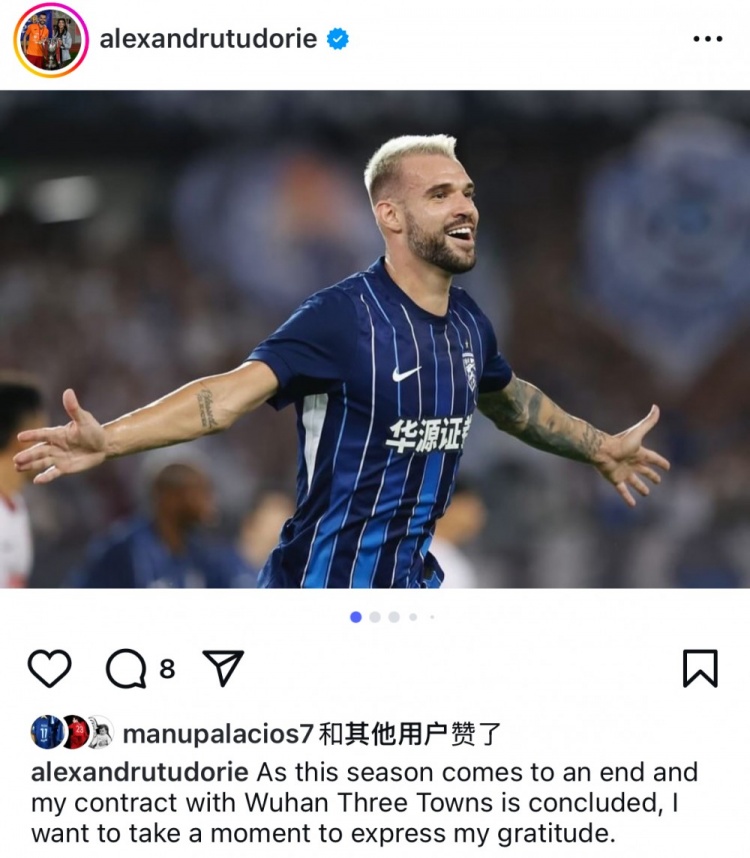 本年年头加盟武汉三镇的罗马尼亚外助图多列,本赛季共代表武汉三镇出战26场,孝顺10个进球。他在社媒告别写谈: