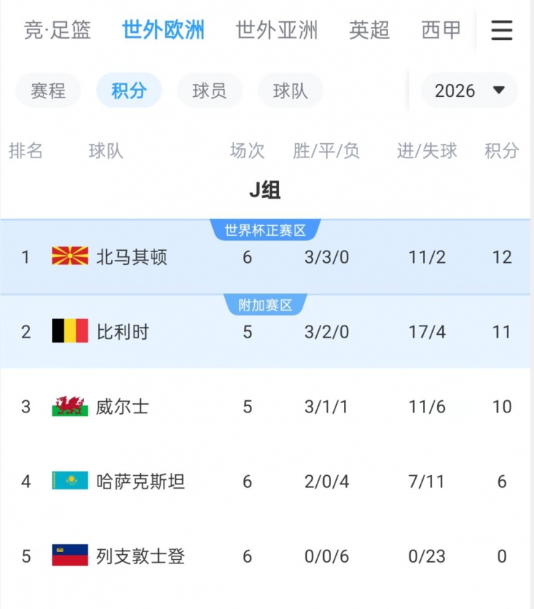 注:当今比利时队位列小组第二,但比北马其顿队少赛一场,比利时队下场将在客场对阵威尔士。