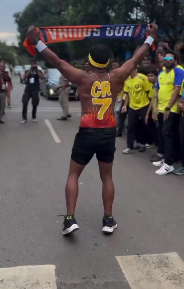 尽管C罗莫得随利雅得见效来到客场,但印度球迷对这场比赛仍然充满关切,有印度球迷在街头师法C罗的记号性庆祝SIU,他的胸前写有“果阿”,背后则是彩绘的“CR7”字样。