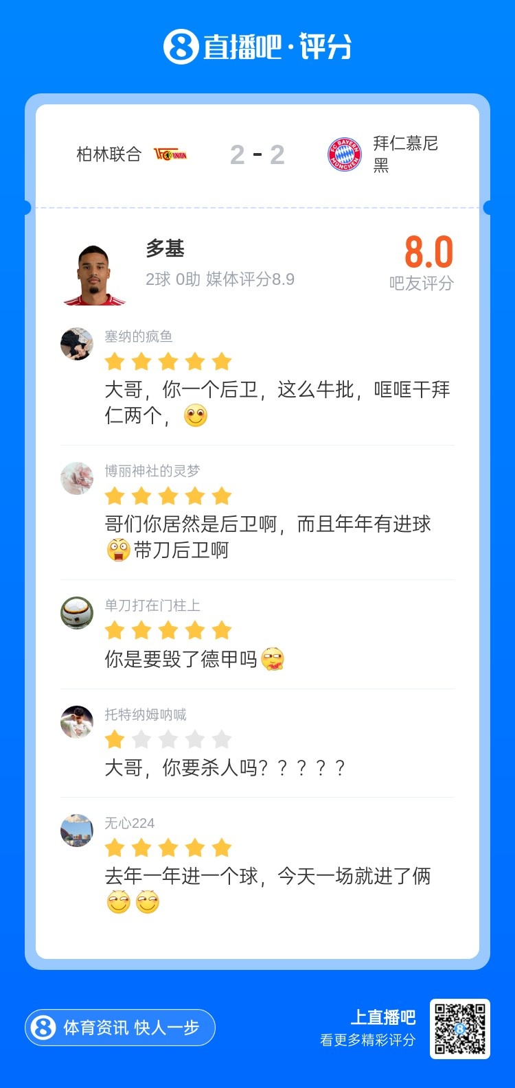吧友热评:年老,你一个后卫,这样牛,哐哐干拜仁两个