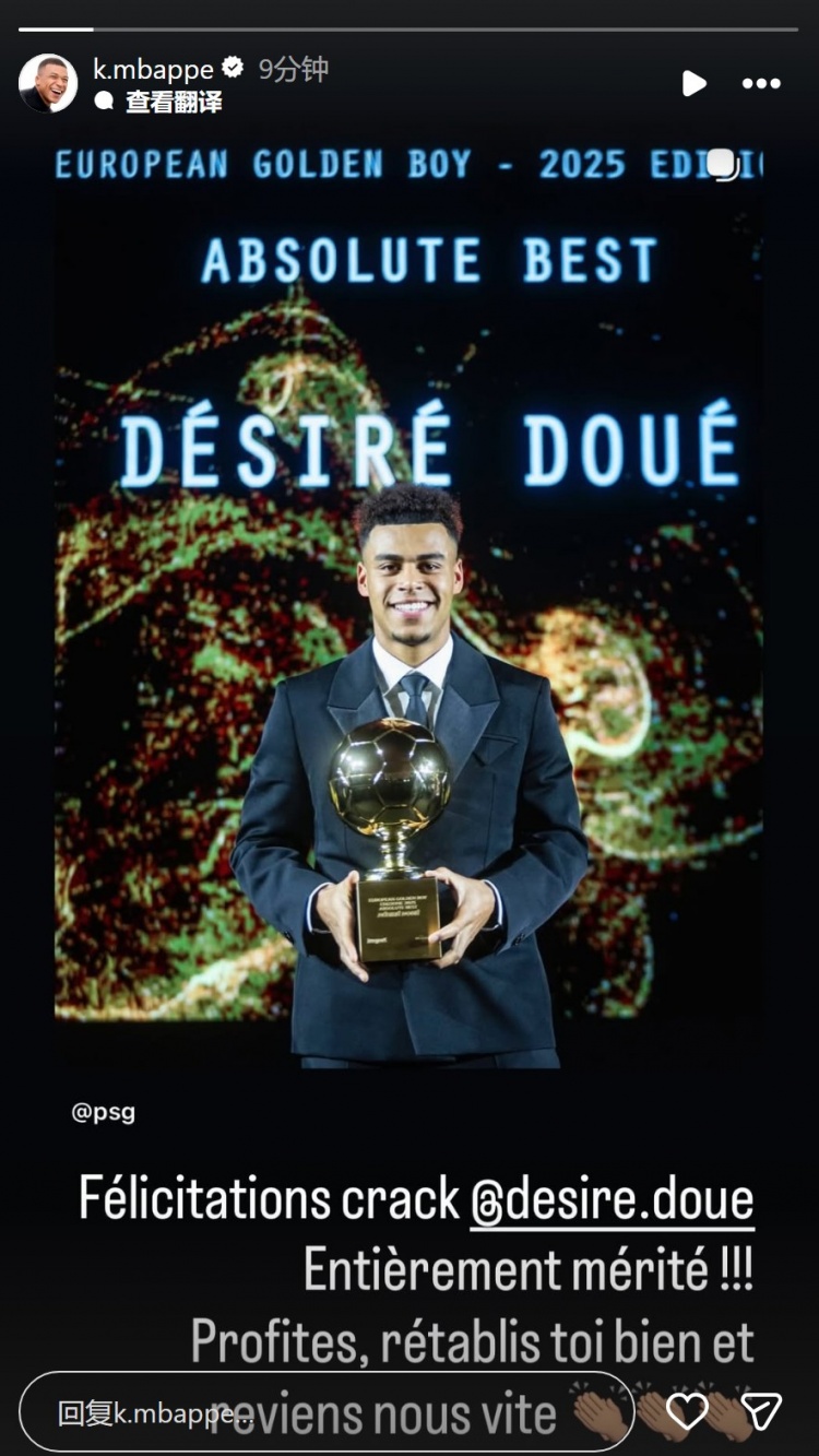 姆巴佩社媒晒出杜埃领奖的像片,配文:“祈福你,天才!实至名归!尽情享受这一刻,尽快康复,早日回来!”