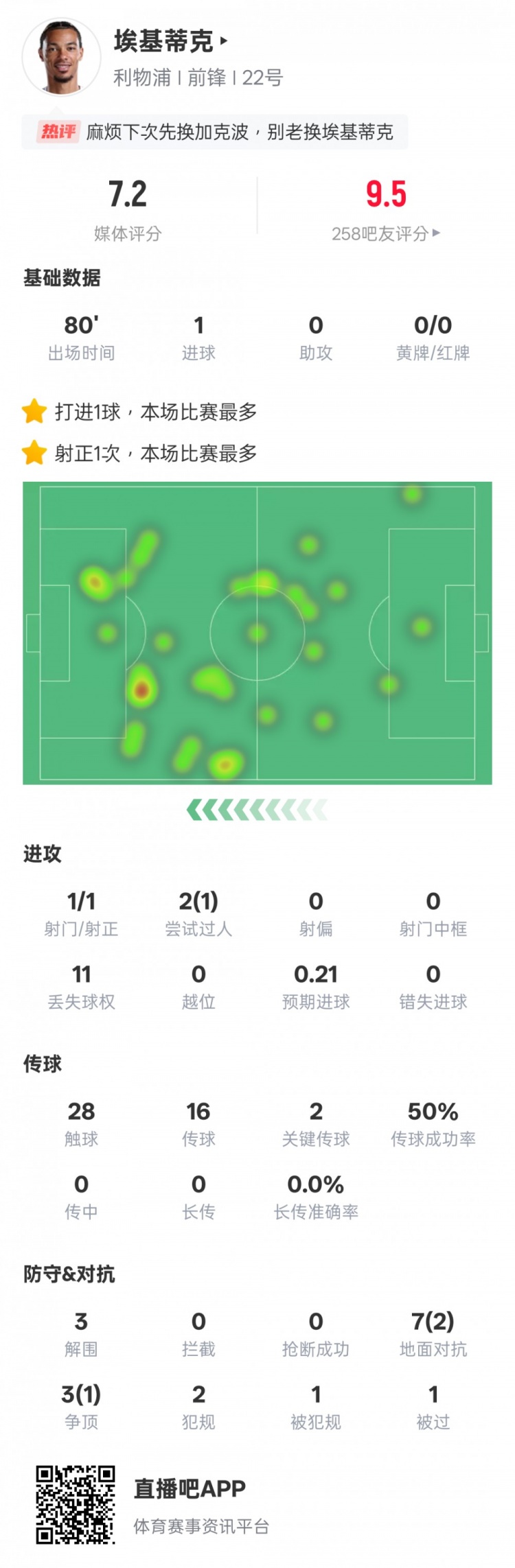 埃基蒂克本场比赛数据:1进球2重要传球3突围,评分7.2