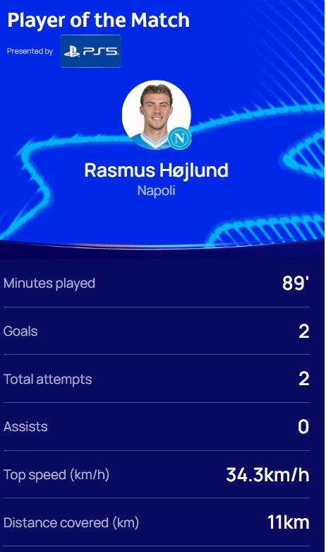 梅开二度,官方:霍伊伦当选那不勒斯2-1葡萄牙体育全场最好