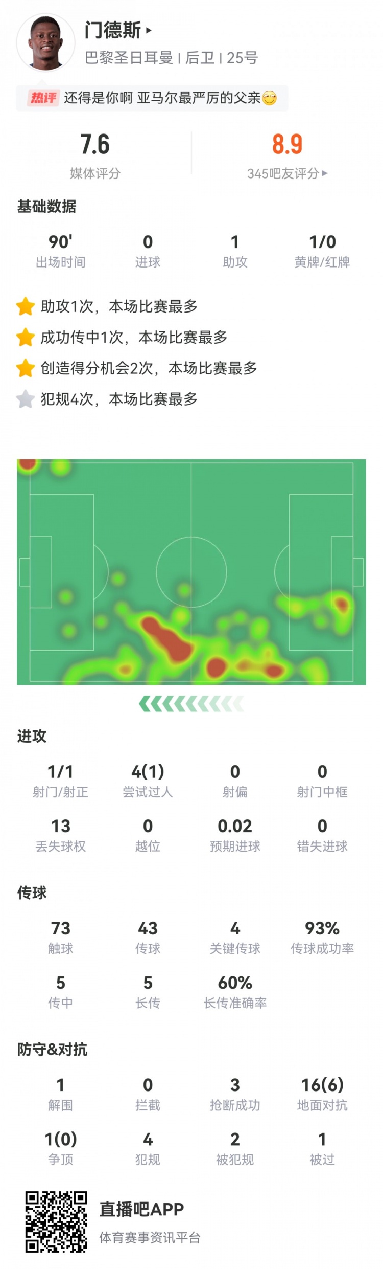 对决亚马尔!门德斯数据:1次助攻,4次要津传球,评分7.6