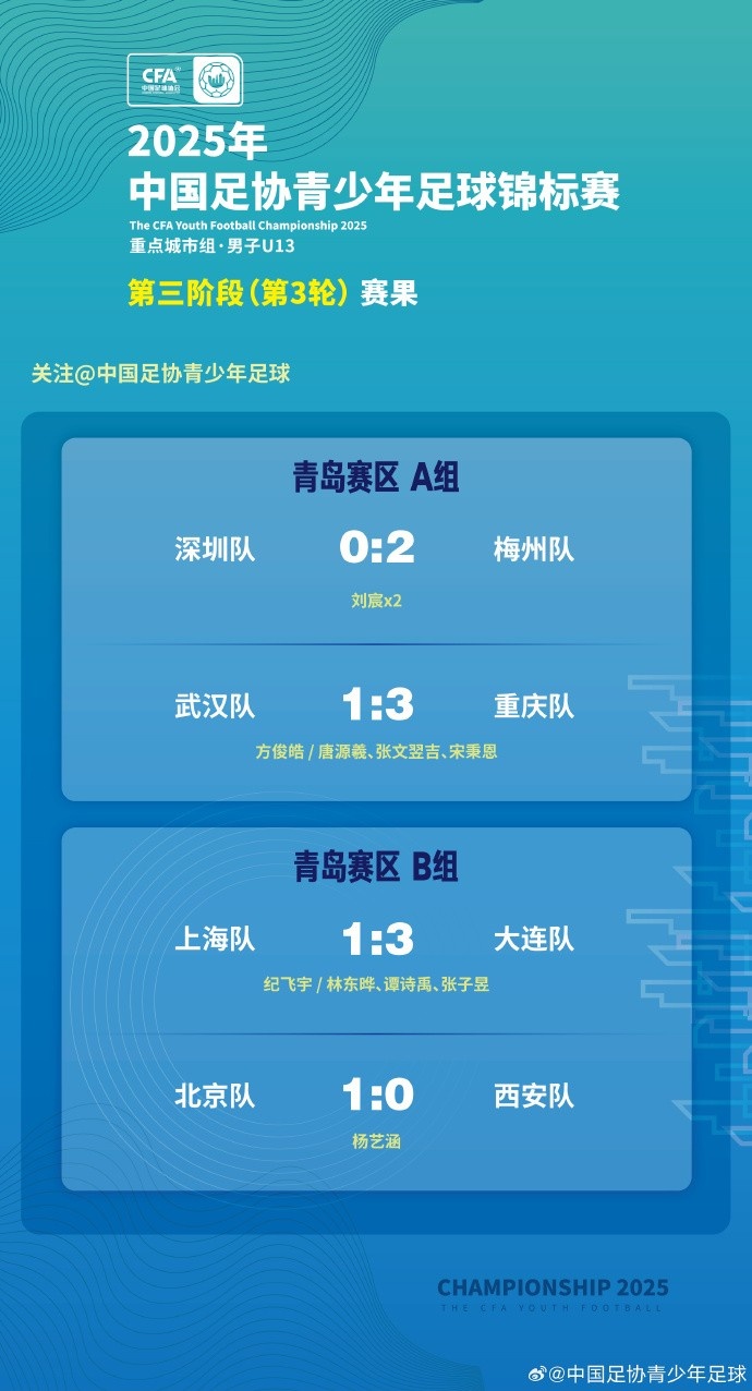 2025年中国足协青少年足球锦标赛重心城市须眉U13组第三阶段第3轮赛果+积分榜 🎙️