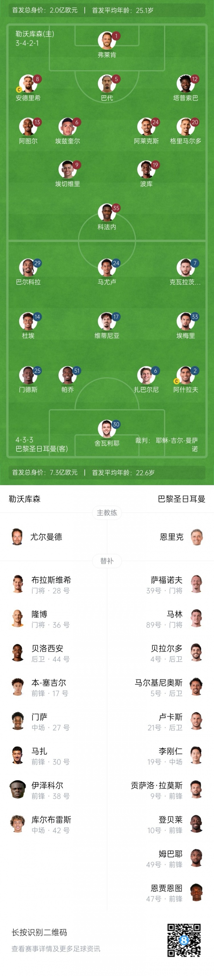 勒沃库森vs巴黎首发:K77、杜埃、门德斯出战 登贝莱替补