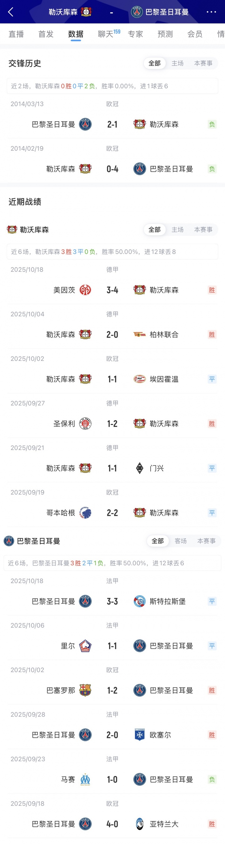 现在勒沃库森碰到欧冠两连平(2-2哥本哈根、1-1埃因霍温),巴黎圣日耳曼则是2连胜(4-0亚特兰大、2-1巴萨)!