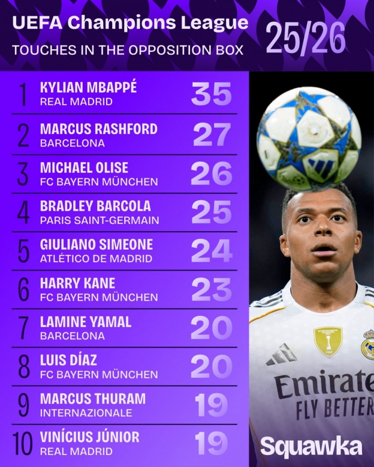 本赛季欧冠对方禁区内触球次数榜:姆巴佩35交替一,拉什福德第二
