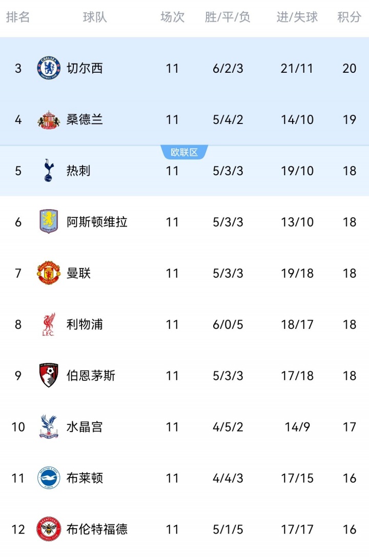 11月10日讯 英超11轮比赛轨则,在积分榜上,中上游球队竞争热烈,从第3名的切尔西到第12名的布伦特福德,分差仅有4分。