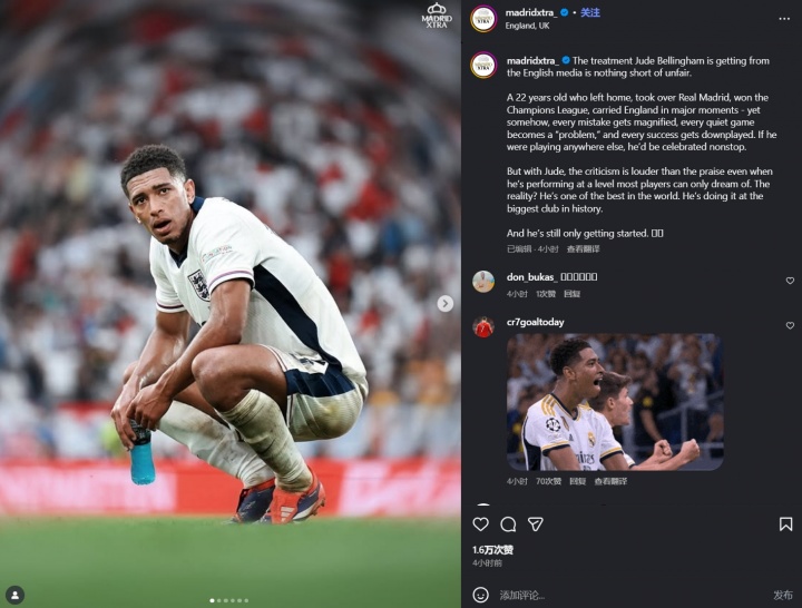 11月18日讯 此前英格兰2-0打败阿尔巴尼亚,贝林厄姆第84分钟被换下,赛后媒体热议其推崇以及下场时的起火样式。皇马关系博主MadridXtra在社媒发文点评。推行如下。