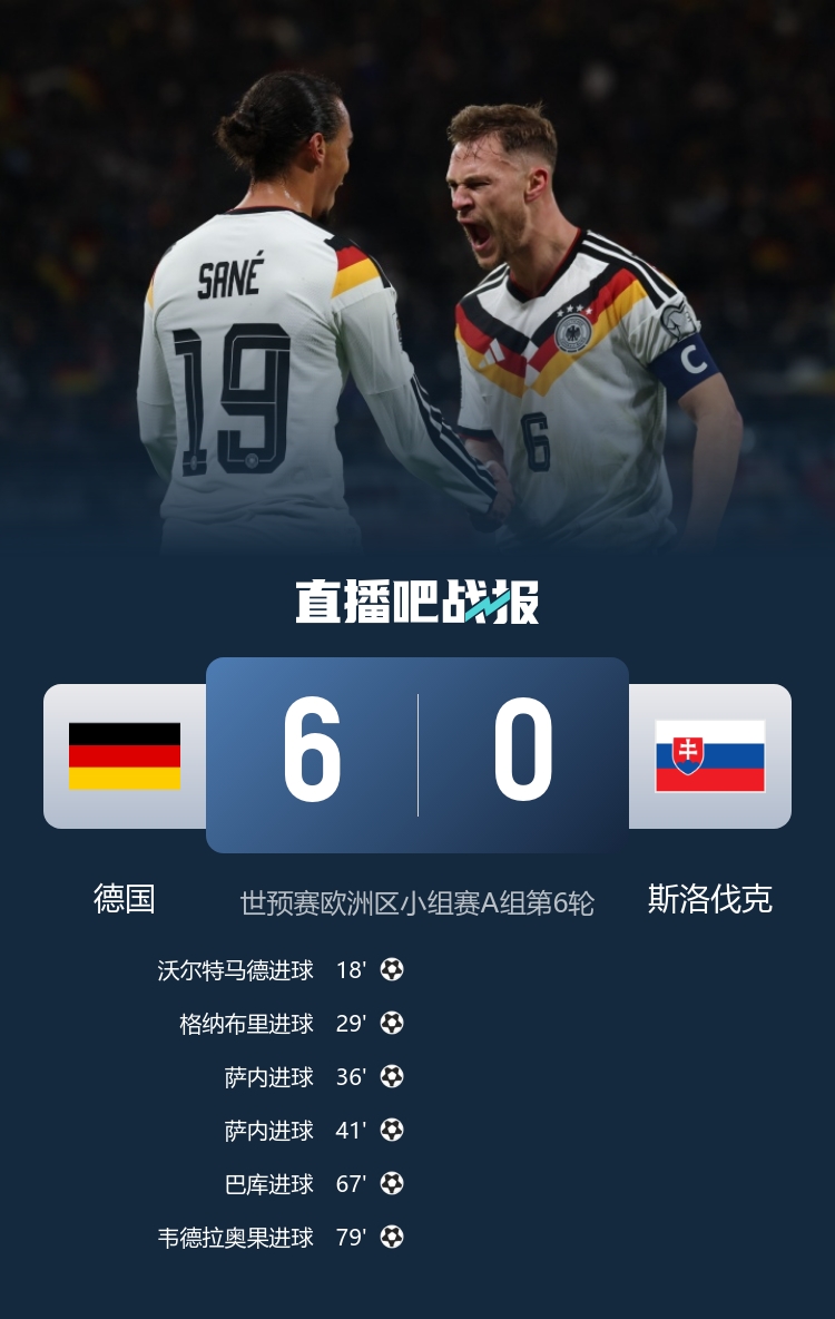 进宇宙杯!德国6-0横扫斯洛伐克 维尔茨两助萨内双响格纳布里传射