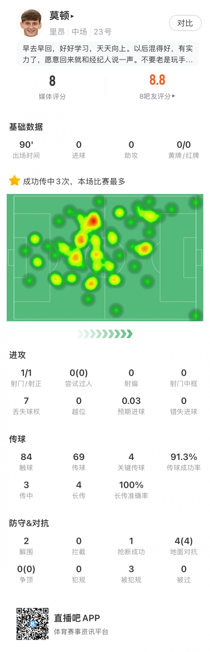在本场比赛中,莫顿的数据极其亮眼,他看成首发后腰送出了4次关节传球,长传得手率是100%。
