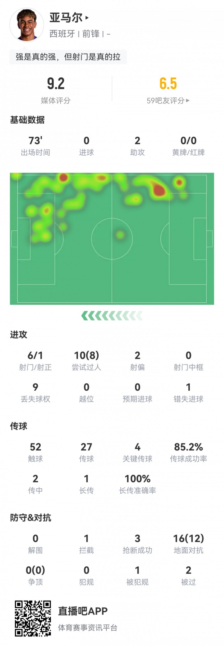 个东说念主秀场!亚马尔数据:2次助攻8次过东说念主12次见效叛逆,评分9.2