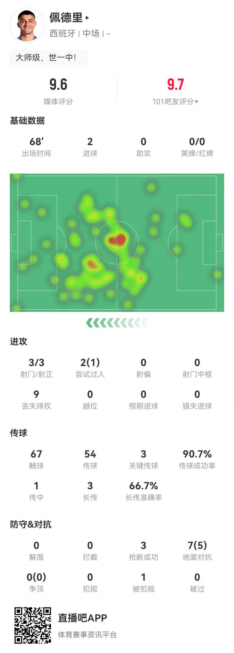 佩德里本场3射3正进2球+3要道传球,7招架5得胜+3抢断 获评9.6分