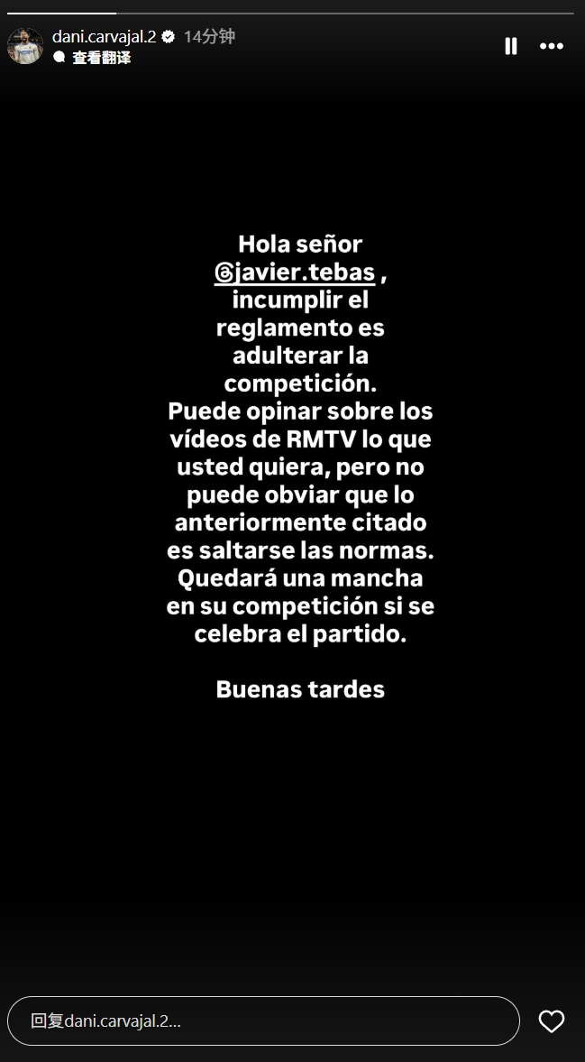 卡瓦哈尔:你好,特巴斯先生。违犯限定即是稠浊比赛。你不错对此前皇马TV发布的视频发表你思要说的任何想法。但你不成否定之前所提到的实践(国际赛)即是违犯了功令。要是进行国际赛,你的比赛就会有弊端。