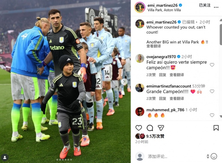 维拉门将马丁内斯也在赛后晒出本场像片,配文写说念:“不管谁看低你,齐不算数。在维拉公园球场又一场进犯顺利!”