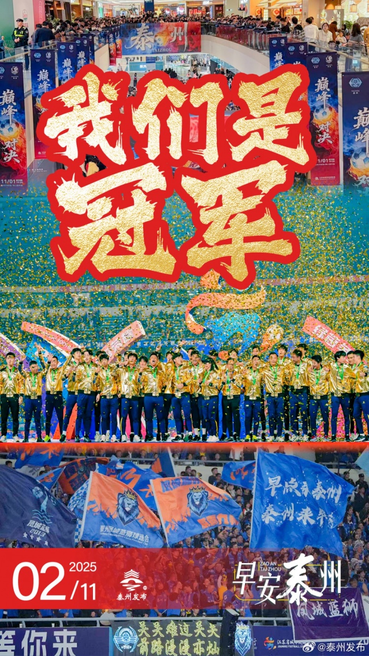 泰州发布道喜泰州队夺冠:敬佩敬佩的力量!敬佩名胜!