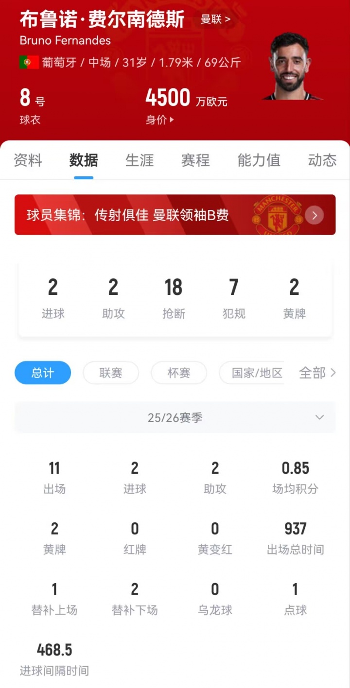 B费在本赛季曼联的总共英超比赛中皆首发出场,登场本领仅次于德里赫特。