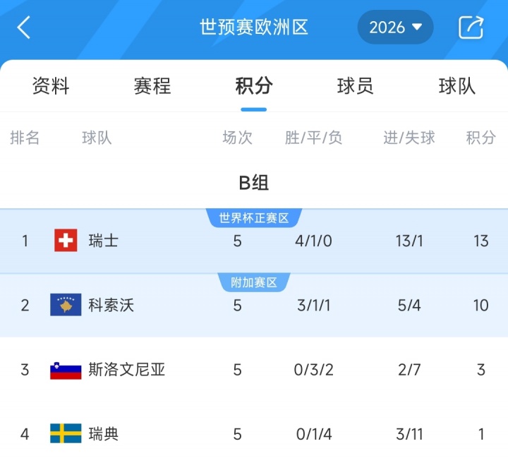 11月16日讯 世初赛欧洲区小组赛B组第5轮,斯洛文尼亚主场0-2负于科索沃,提前一轮详情无缘2026寰宇杯。