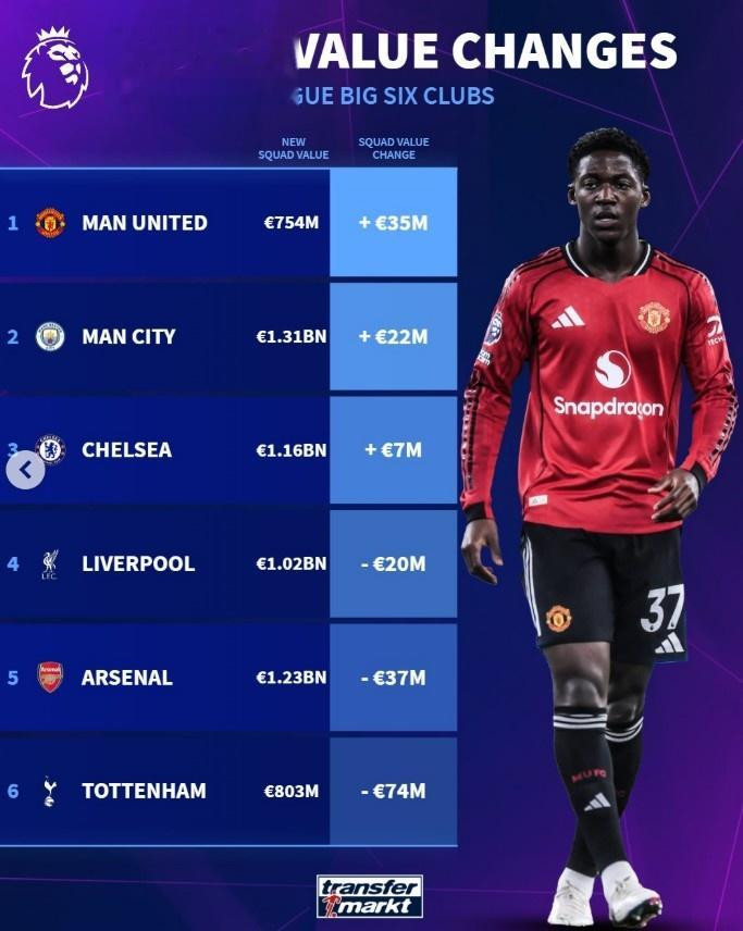英超Big6队伍身价变化榜: 曼联+3500万欧上涨最多, 热刺跌幅最大