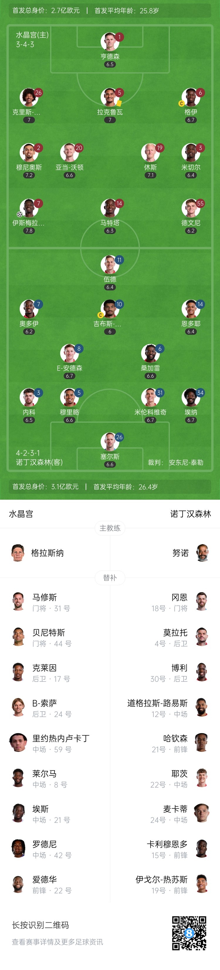 半场-水晶宫1-0跨越诺丁汉丛林 伊斯梅拉-萨尔破门格伊中柱