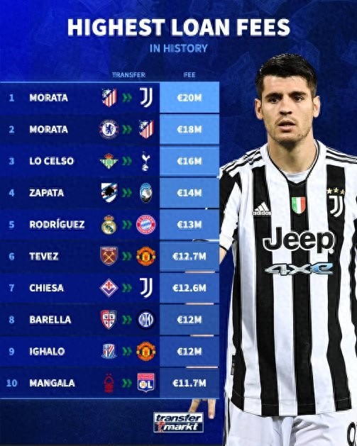 最贵租赁榜: 杰克逊将成历史第三贵租赁交游, 莫拉塔1800万欧居首