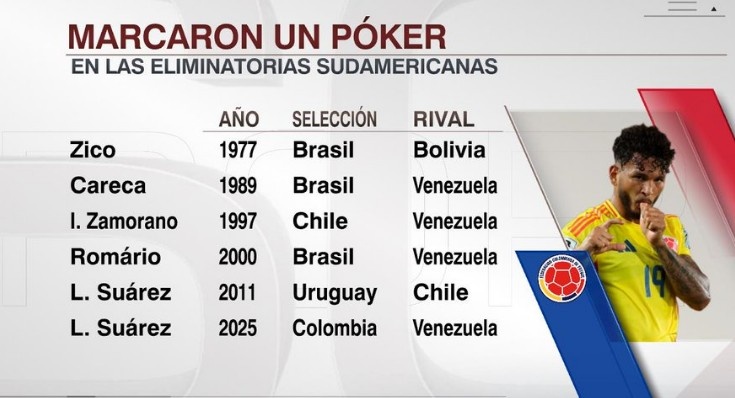 9月10日讯 在本轮南好意思区世初赛哥伦比亚6-3打败委内瑞拉的比赛中,苏亚雷斯演出大四喜,成为赛事历史第6位作念到这少量的球员,具体如下: