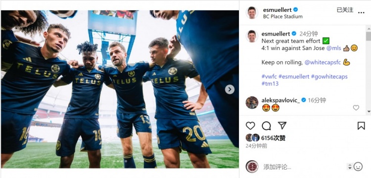 穆勒社媒晒出与队友的合照,配文:“又一场出色的团队证据,4-1打败圣何塞。赓续前进,温哥华白浪!”