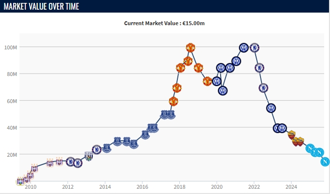 卢卡库曾在遵守曼联和国米时身价达到1亿欧,其时他永诀是25岁和28岁。切尔西在2021年曾为他支付1.13亿欧,然则买入之后只用了一个赛季,背面接连租出国米和罗马并最终卖给那不勒斯。
