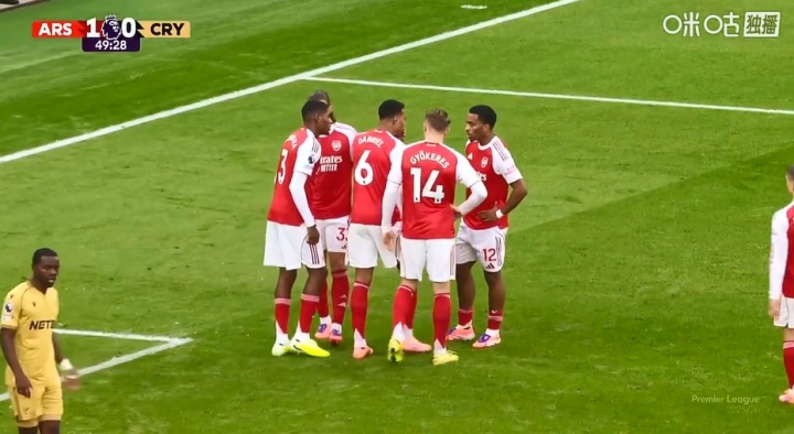 有套路!开定位球前枪手球员聚在全部参议战略,随后加布头球中柱