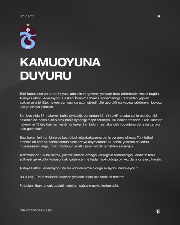 10月27日讯 土超特拉布宗俱乐部发表公开声明,回复土耳其足协主席哈奇奥斯马诺格鲁所揭露的裁判界“结构性恶臭”问题。