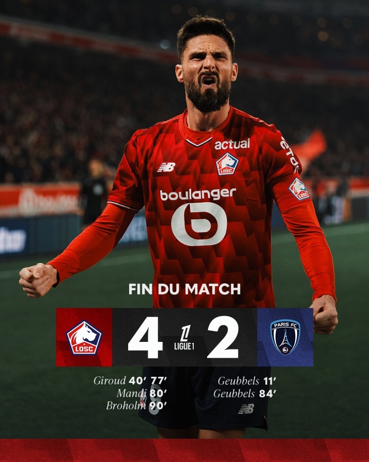 11月24日讯 法甲第13轮,里尔主场4-2逆转巴黎FC,39岁的里尔中锋吉鲁本场比赛梅开二度,赶走各项赛事9场进球荒。据OPTA统计,吉鲁也成为1947/1948赛季以来,法甲梅开二度年齿最大的球员。