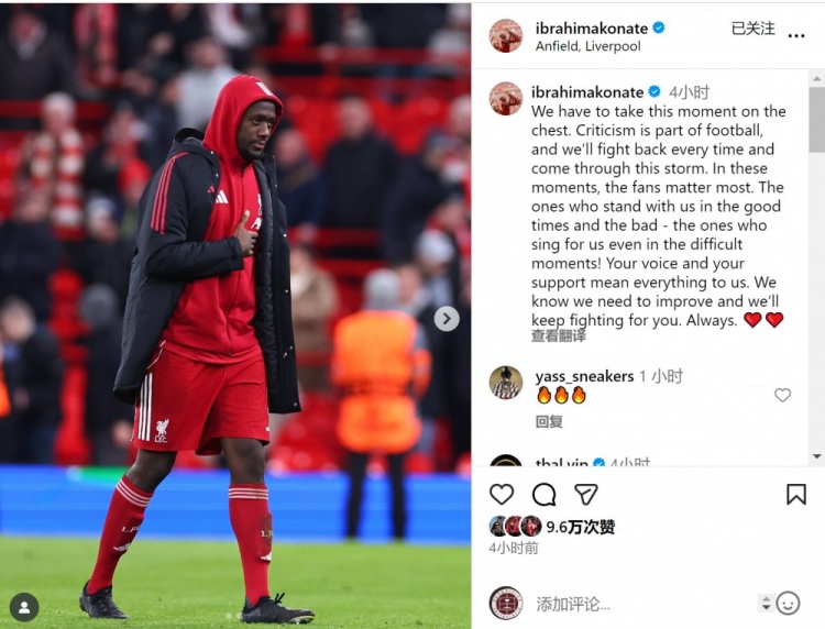 利物浦中卫科纳特社媒写说念:“咱们必须镇定濒临此刻的困境,品评是足球的一部分,但咱们每次齐会奋起反击,最终度过这场风暴。”