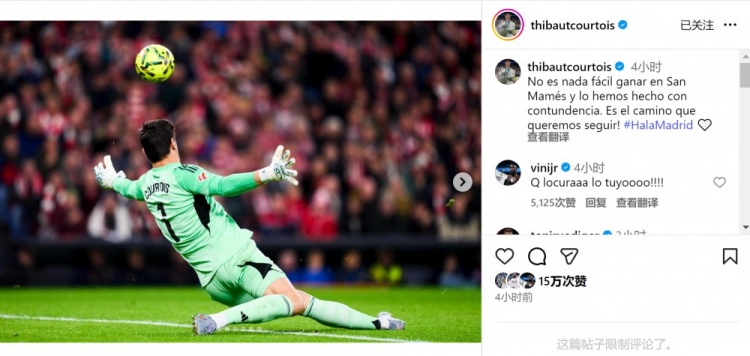 库尔图瓦社媒晒出扑救相片,配文:“在圣马梅斯取胜绝非易事,而咱们今天得回干脆利落。这恰是咱们思要赓续前进的谈路!”