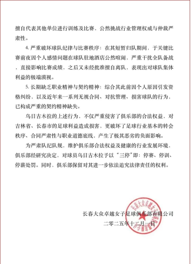 乌日古木拉的上述活动,不仅严重侵害了俱乐部的正当权益,对吉林省、长春市的足球利益形成毁伤,更破损了足球行业基本的转会次第、合同严肃性与处事说念德底线,产生了极其恶劣的负面影响。为严肃队纪队规,难得俱乐部正当权益及健康的行业发展环境,俱乐部经盘问决定,对球员乌日古木拉给以“三停”即:停赛、停训、停薪处罚。同期,俱乐部保留对其进一步照章追究法律连累的权柄。