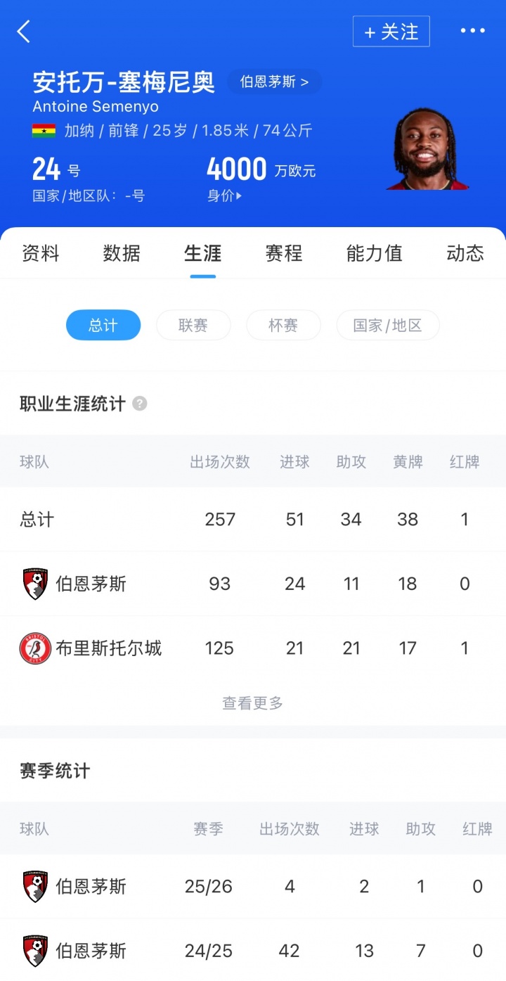 塞梅尼奥现年25岁,加纳时尚,上赛季代表球队42场,孝顺13球7助,本赛季4场2球1助。现在球员德回身价为4000万欧元。